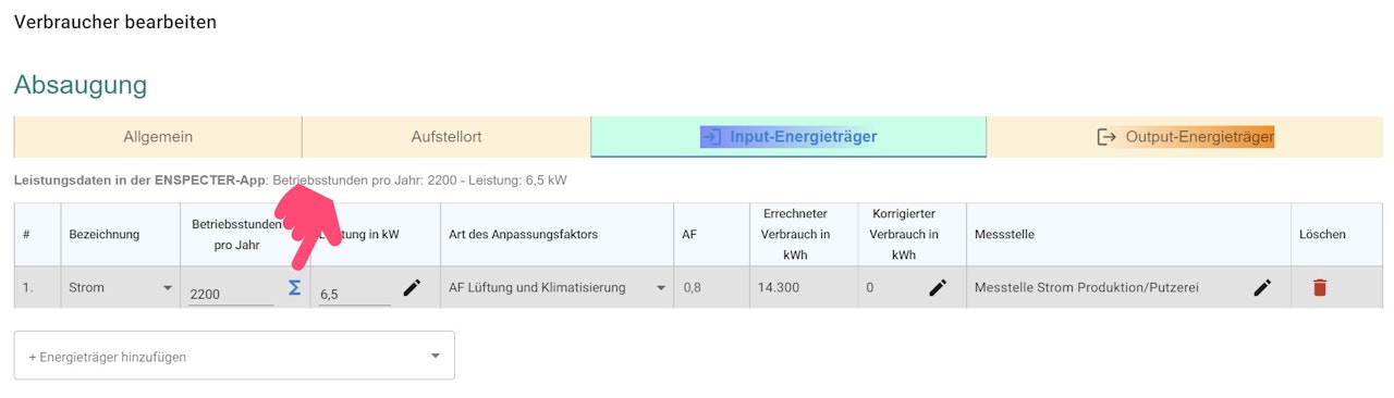 In der Verbraucherliste, oder im Verbraucher-Bearbeiten-Popup können die Betriebszeiten eingegeben werden. Für eine detaillierte Eingabe drücken Sie auf das Summen-Zeichen, wie im Bild zu sehen. Es öffnet sich ein Popup-Dialog in dem Sie einen Zeitplan hinterlegen können.