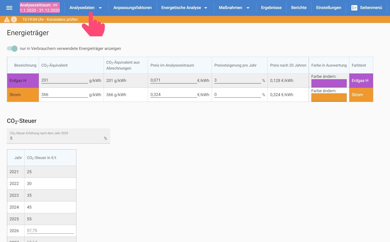 Alle diese Einstellungen werden auf der Seite "Energieträger" in den Analysedaten vorgenommen.