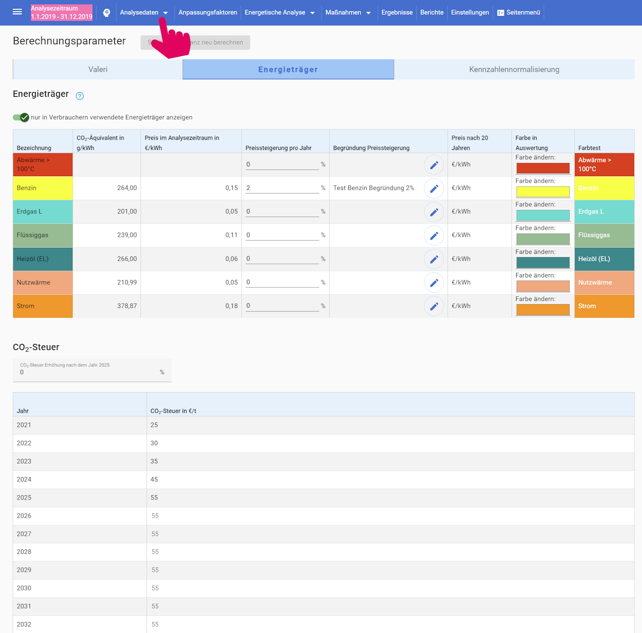 Die Daten eines Energieträgers können Sie auf den Seiten Berechnungsparameter und direkt auf der Energieträgerseite der Analysedaten ändern.