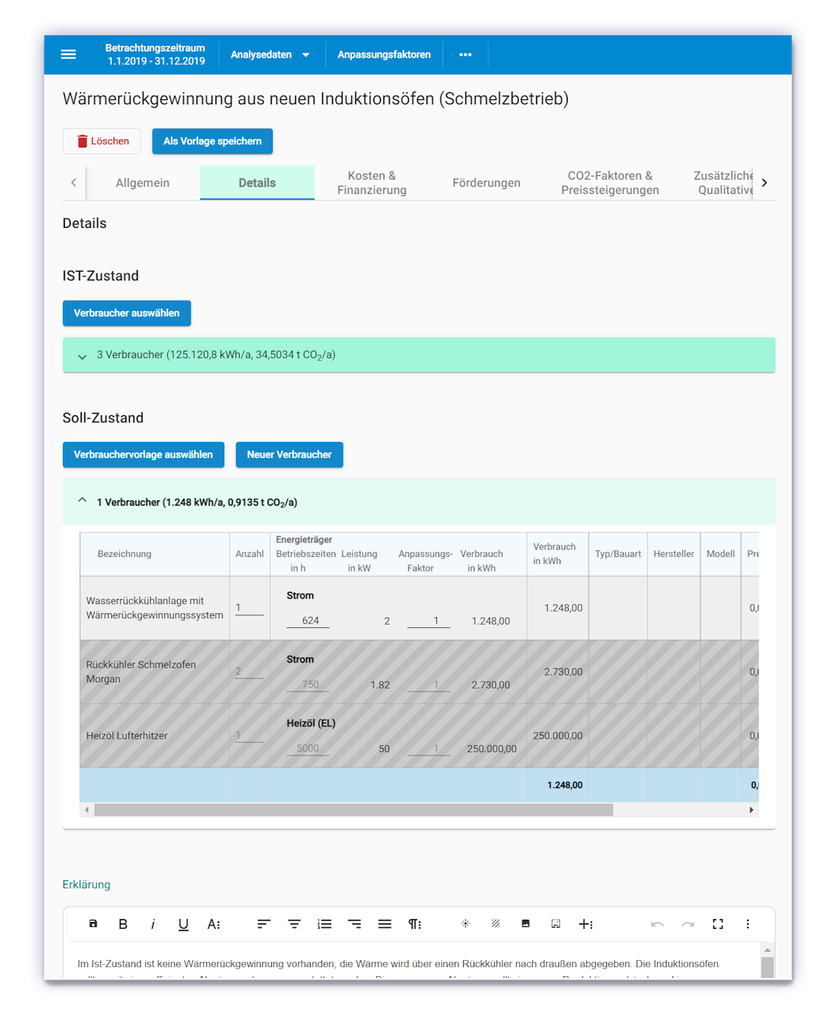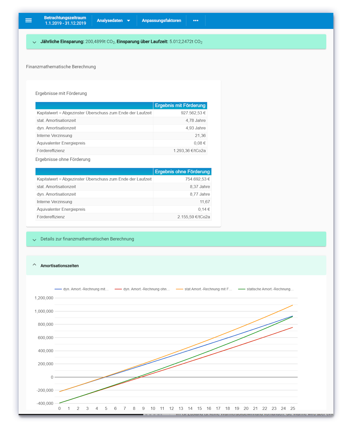 Für jeden Maßnahmentyp steht eine spezielle Eingabemaske zur Verfügung. Als Resultat erhälst du zahlreiche Diagramme, Tabellen und Auswertungen.