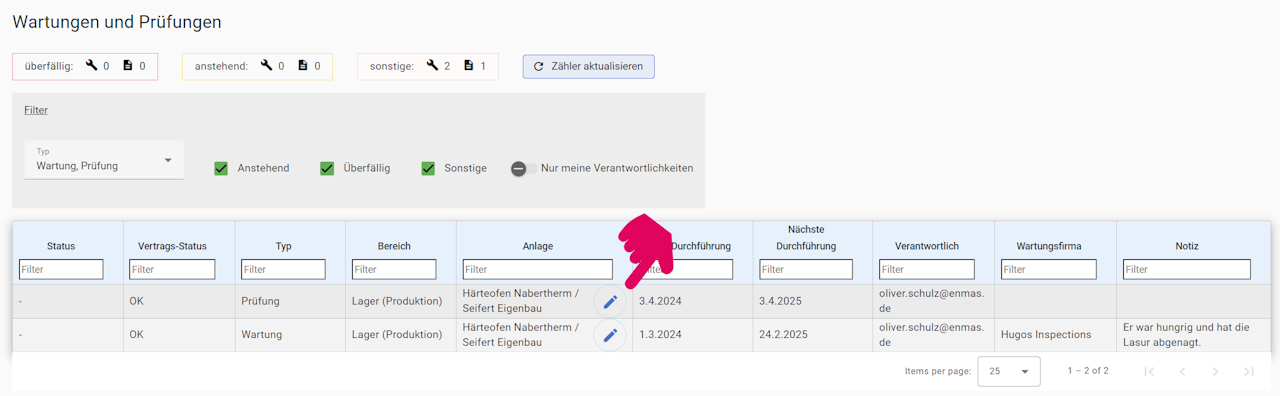 Mit Klick auf das Bearbeiten Symbol neben dem Namen der Anlage wird das Verbraucher-bearbeiten Popup geöffnet, welches auch Tabs für die Bearbeitung der Wartungen/ Prüfungen enthält.