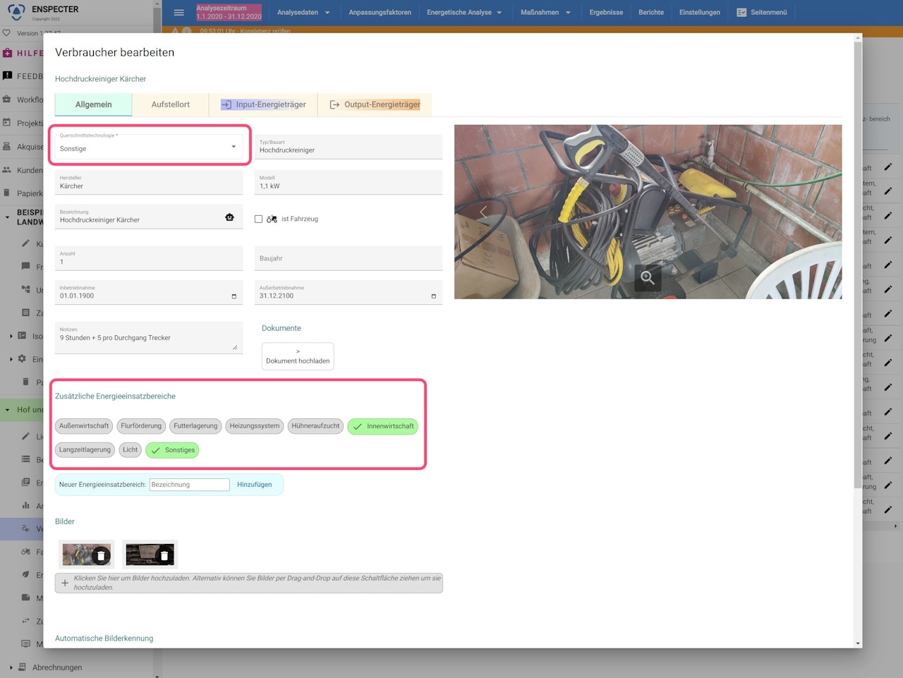 Die Querschnittstechnologie wählst du im Popup zum Bearbeiten des Verbrauchers gleich als erstes aus. Die Energieeinsatzbereiche können durch klicken auf den jeweiligen Bereich aus-/ und abgewählt werden.