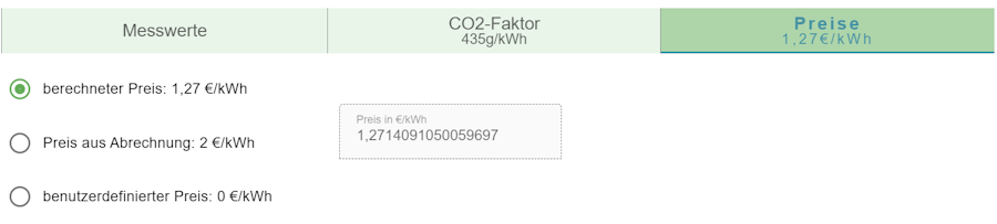 ENSPECTER zeigt noch eine weitere Tabelle die auf Bezugskosten und CO2-Faktoren basiert. Dabei wird der Zwischenschritt der internen Preis und CO2-Faktorberechnung ausgelassen und es wird mit den Bezugspreisen gerechnet.
