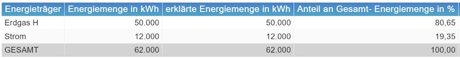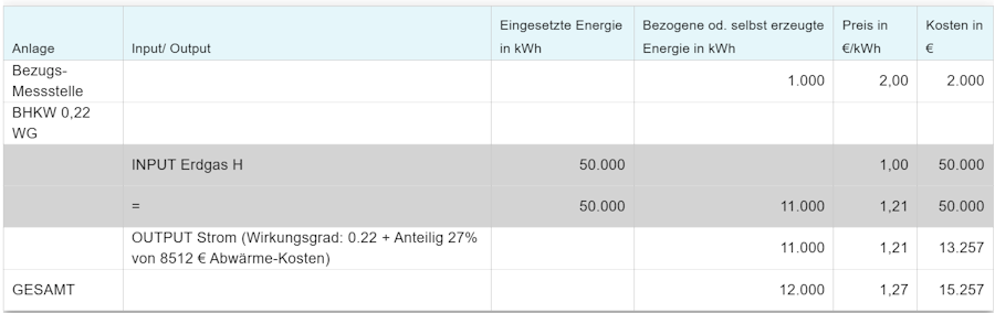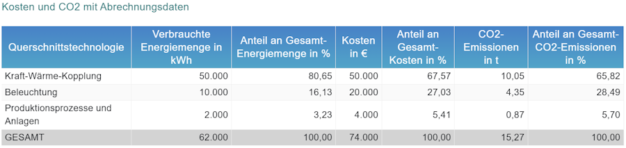 Es ist hierbei zu beachten, dass die Verbräuche der Querschnittstechnologien als vollkommen unabhängige Größen dargestellt werden. Der Prozess der KWK verbraucht 50.000 kWh. Das sie davon ca. 32.000 kWh in Form von Wärme und Strom den anderen Prozessen im Unternehmen zur Verfügung stellt wird in der ersten Zeile nicht berücksichtigt. Die Beleuchtung und die Produktionsprozesse und Anlagen verbrauchen 12.000 kWh Strom, dass dieser Strom nur zu 1.000 kWh vom EVU bezogen wird und 11.000 kWh Stunden selbst erzeugt wurden, ist dabei unerheblich.