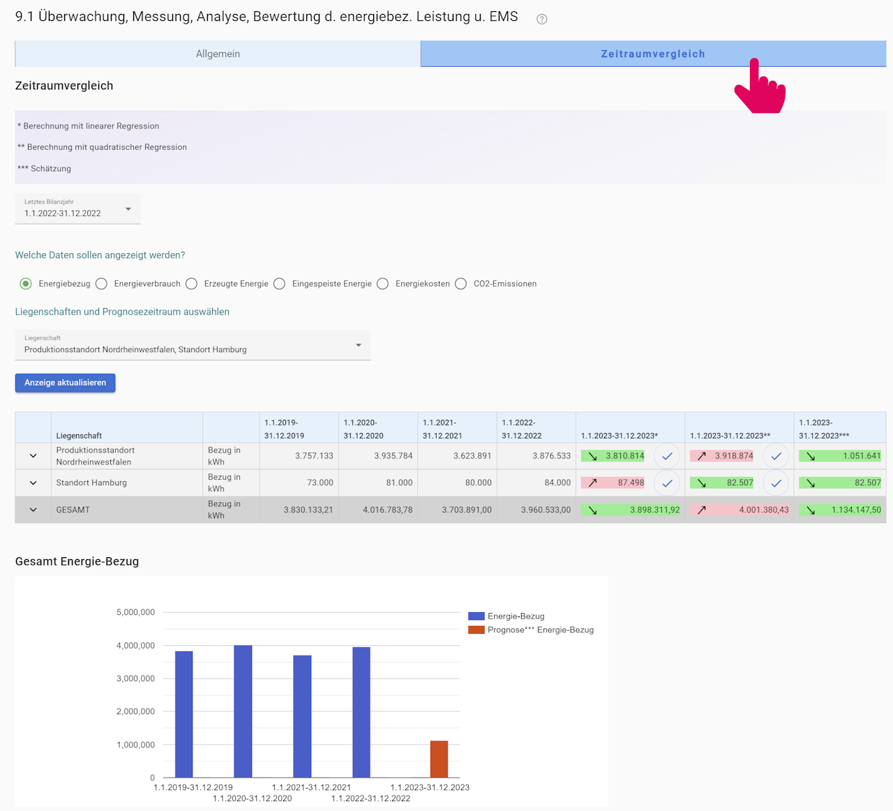 Im Zeitraumvergleich können Sie zukünftige Energieverbräuche, -bezüge, Erzeugung und Einspeisung schätzen und analysieren. Sie finden den Vergleich auf dem Tab "Zeitraumvergleich" der Seite 9.1 „Überwachung, Messung, Analyse und Bewertung der energiebezogenen Leistung“ im Bereich ISO 50.001.