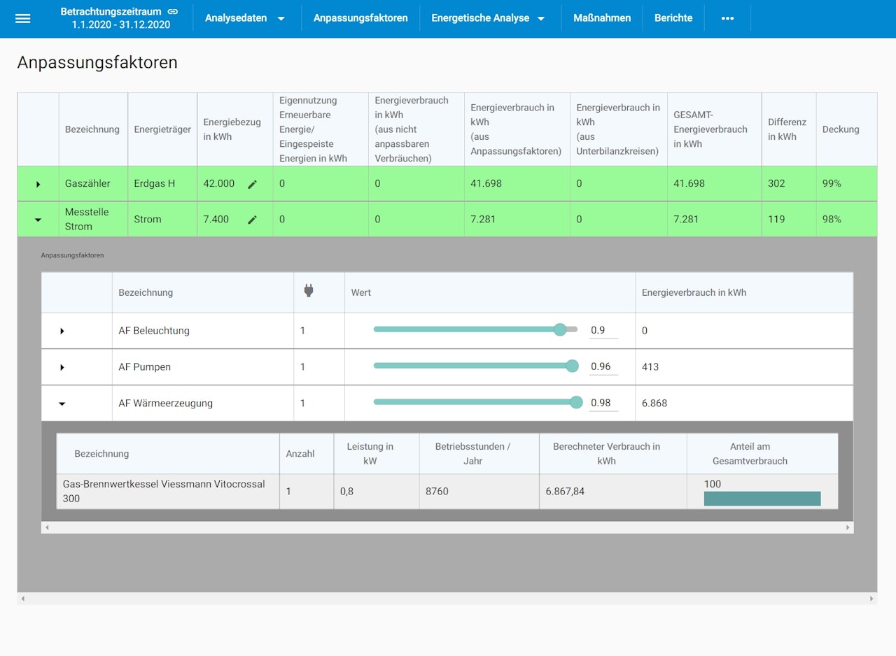 Anlagen und Prozesse laufen in der Regel nicht in der maximalen Intensität. Deshalb ist die tatsächliche durchschnittliche Leistung nicht gleich der angebenen Nennleistung. Auch die Laufzeiten weichen häufig deutlich von den Annahmen ab und sind bei weitem nicht in jedem Jahr gleich. Beide Effekte führen dazu, dass errechnete Verbräuche nicht mit der Realität übereinstimmen. Sofern keine Messwerte vorliegen, kann dieses Missverhältnis nur mit dokumentierten Anpassungsfaktoren transparent ausgeglichen werden.