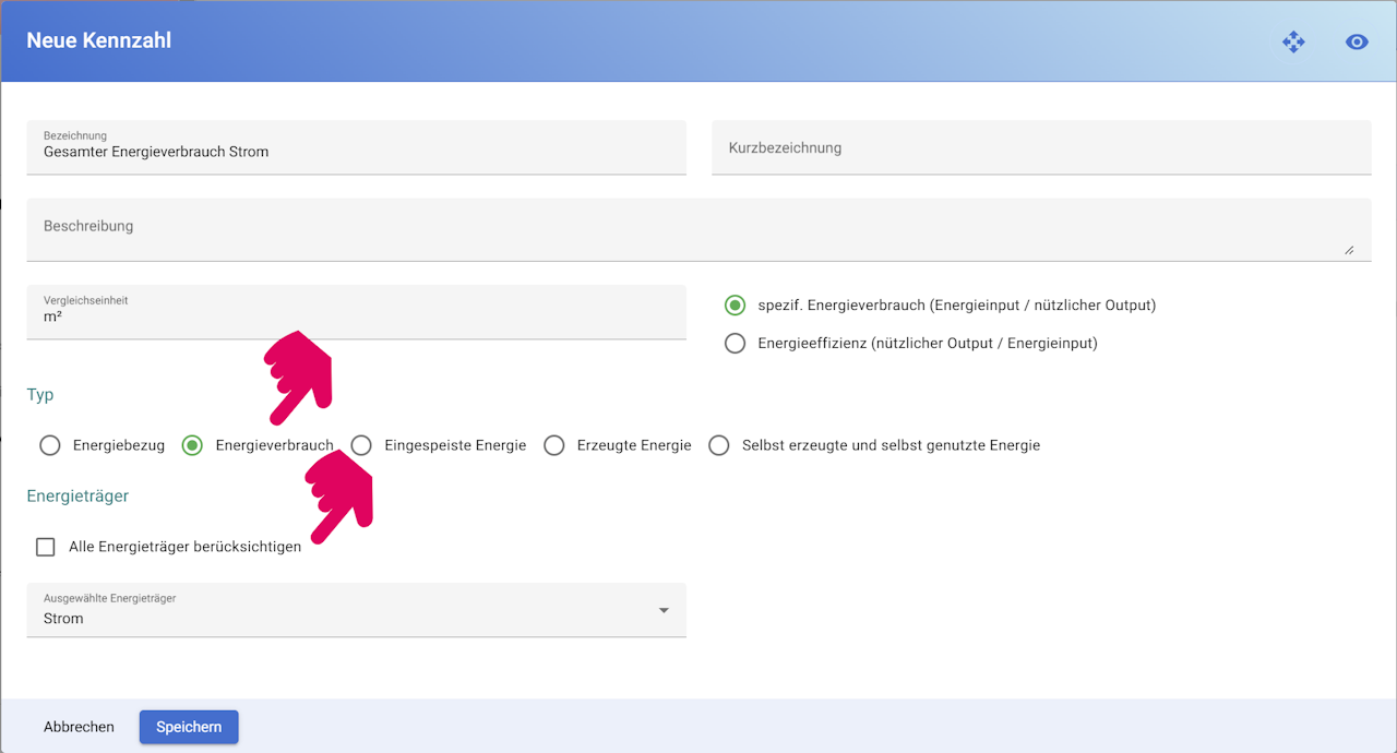 Mit dem Button „Neue Kennzahl“ können Sie benutzerdefinierte Kennzahlen hinzufügen. Im sich öffnenden Dialogfenster wählen Sie die Basisgröße (z. B. Energieverbrauch, Energiebezug) sowie die zu berücksichtigenden Energieträger. Beispielsweise können Sie eine Kennzahl für den gesamten Energieverbrauch Strom pro m² erstellen.