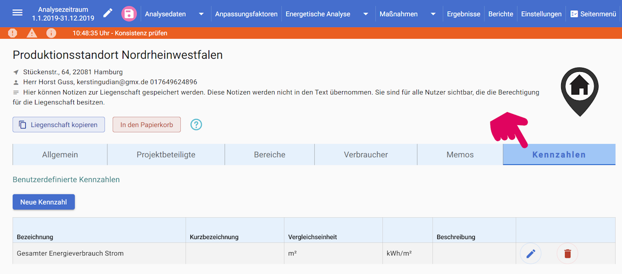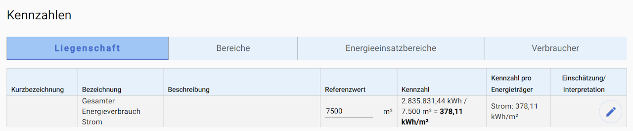 In der Liegenschafts-Detail-Seite finden Sie den neuen Tab „Kennzahlen“. Dort können Sie individuelle Kennzahlen anlegen, wie z. B. den „Gesamten Energieverbrauch Strom pro m²“. Dies macht es überflüssig, einen allgemeinen Energieeinsatzbereich für die gesamte Liegenschaft zu definieren.