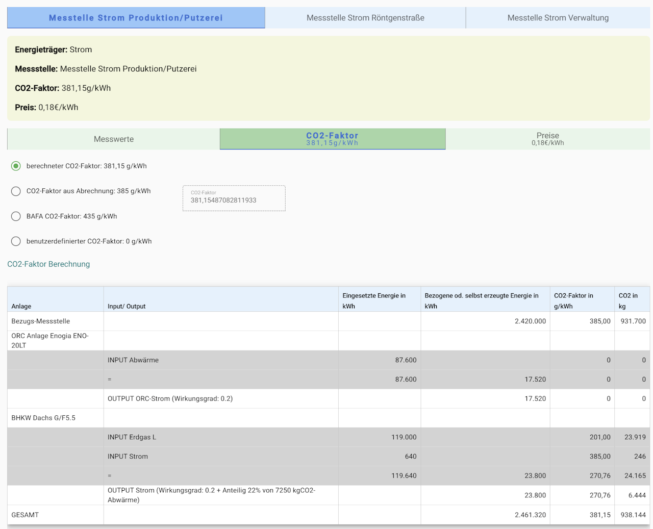 Der in der Analyseperiode verwendete CO₂-Faktor und Preis pro kWh wird basierend auf den Daten der Bezugsmessstellen pro Energieträger sowie den erzeugten Energien automatisch berechnet.