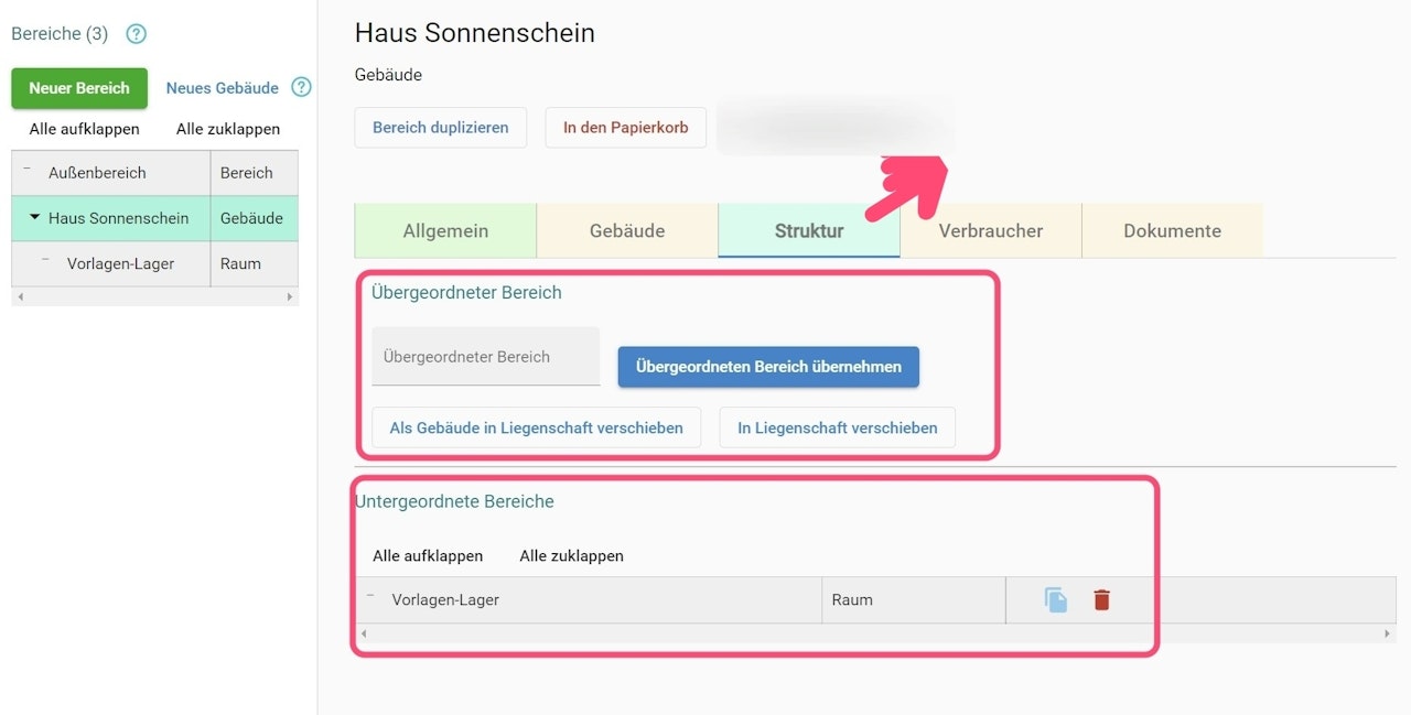 Im Beispielbild ist der Bereich "Haus Sonnenschein" abgebildet. Haus Sonnenschein ist ein Gebäude und enthält den Raum "Vorlagen-Lager".