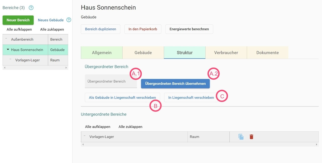B: den ausgewählten Bereich als Gebäude in die Liegenschaft verschieben. Dabei wird der Typ des Bereichs auf Gebäude geändert und der Bereich liegt auf oberster Hierarchie-Ebene.