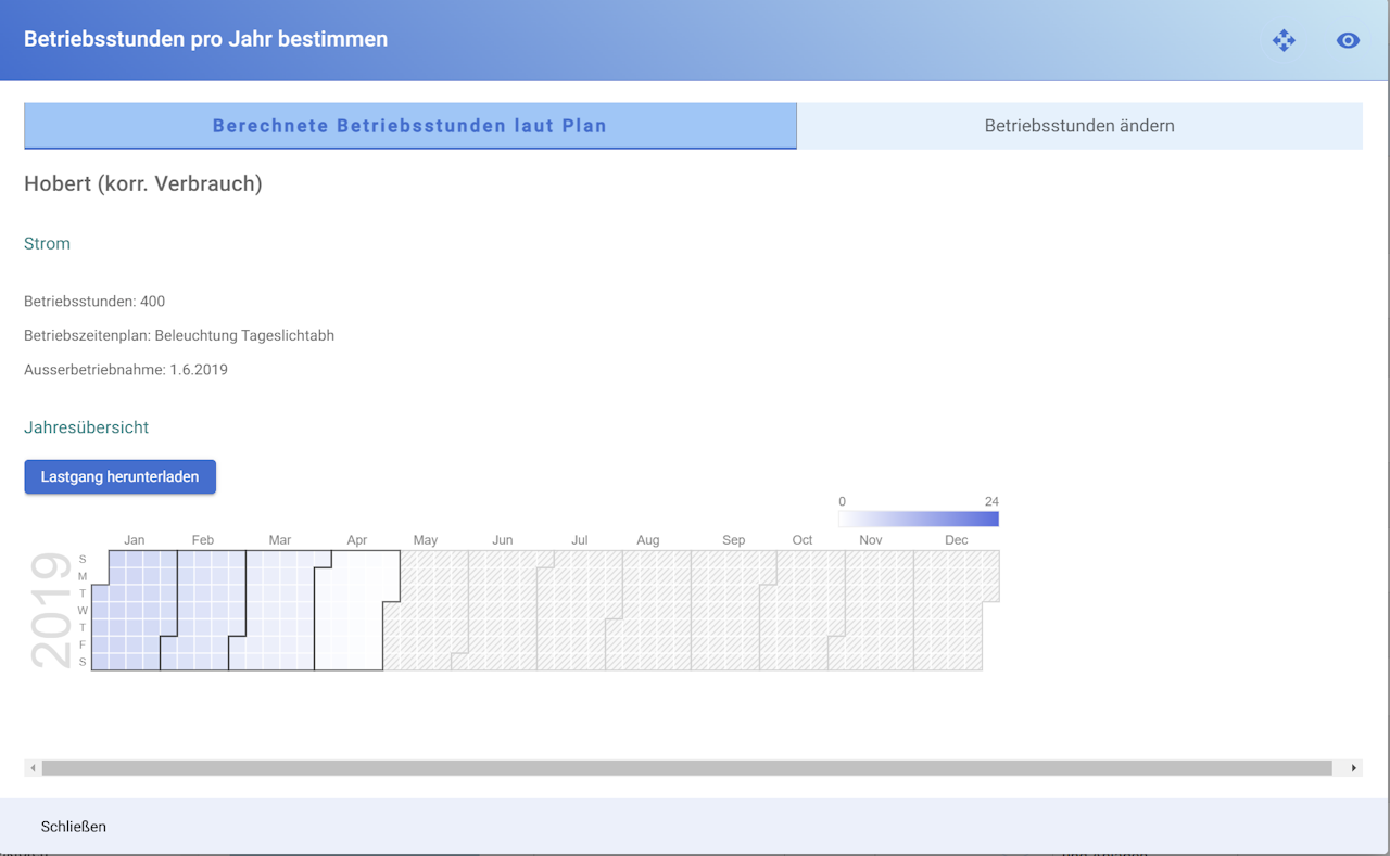 Für jeden Verbraucher mit einem Betriebszeitenprofil wird eine anschauliche Jahresübersicht der Betriebsstunden erstellt.