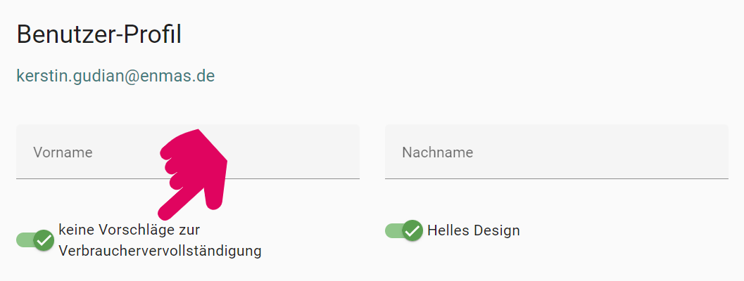 Wählen Sie dafür in der Top-Navigation den Menüpunkt "Einstellungen" > "Benutzer-Einstellungen". Auf der Benutzungsoberfläche wählen Sie dann den Punkt "keine Vorschläge zur Verbrauchervervollständigung" .