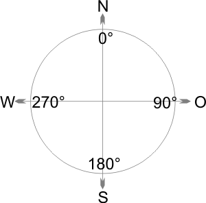 Die Ausrichtung gibt die Himmelsrichtung (Azimut) der Dachflächen in Grad an, also sozusagen, wohin die Photovoltaik-Anlage letztendlich "schaut". Dabei entsprechen südlich ausgerichtete Dächer bzw. PV-Anlagen einem Wert von 180° (s. Grafik).