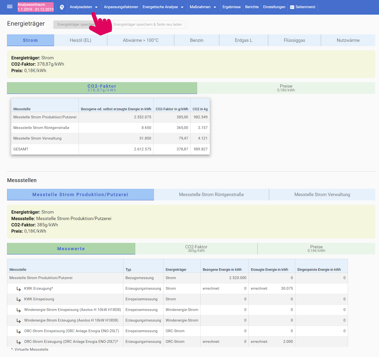Direkt auf der Seite der Energieträger (durch Messtruktur vorgegeben) können Sie: