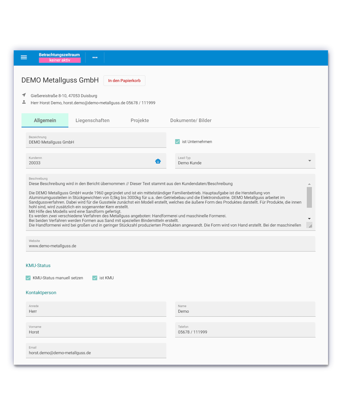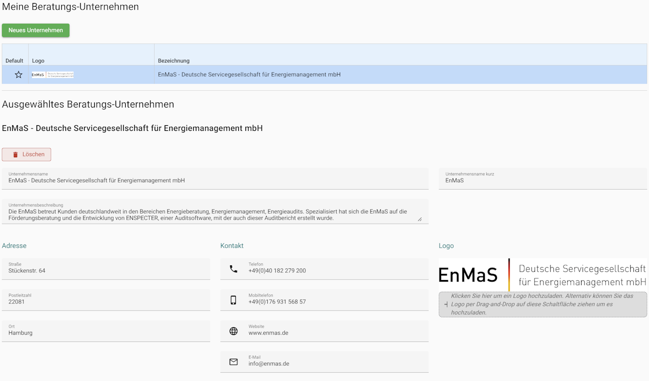 Alle für die Berichterstellung notwendigen Daten für dein Unternehmen werden hier erfasst. Du arbeitest für mehr als ein Unternehmen? Kein Problem lege einfach mehrere Unternehmen an, wir kümmern uns darum, dass immer das richtige Logo auf dem Bericht erscheint.