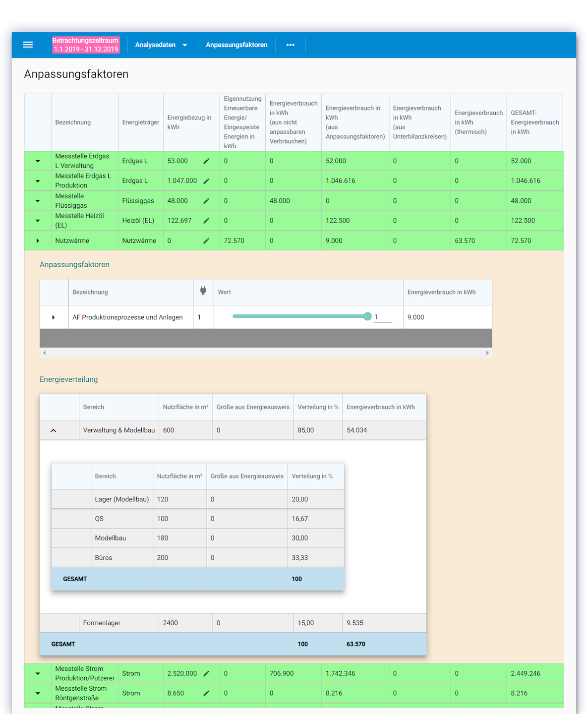 Sobald alle Stammdaten erfasst sind und mit den Anpassungsfaktoren der Ausgleich zwischen Energiebezug und Energieverbrauch hergestellt wurde, errechnet ENSPECTER automatisch die Energiebilanz.