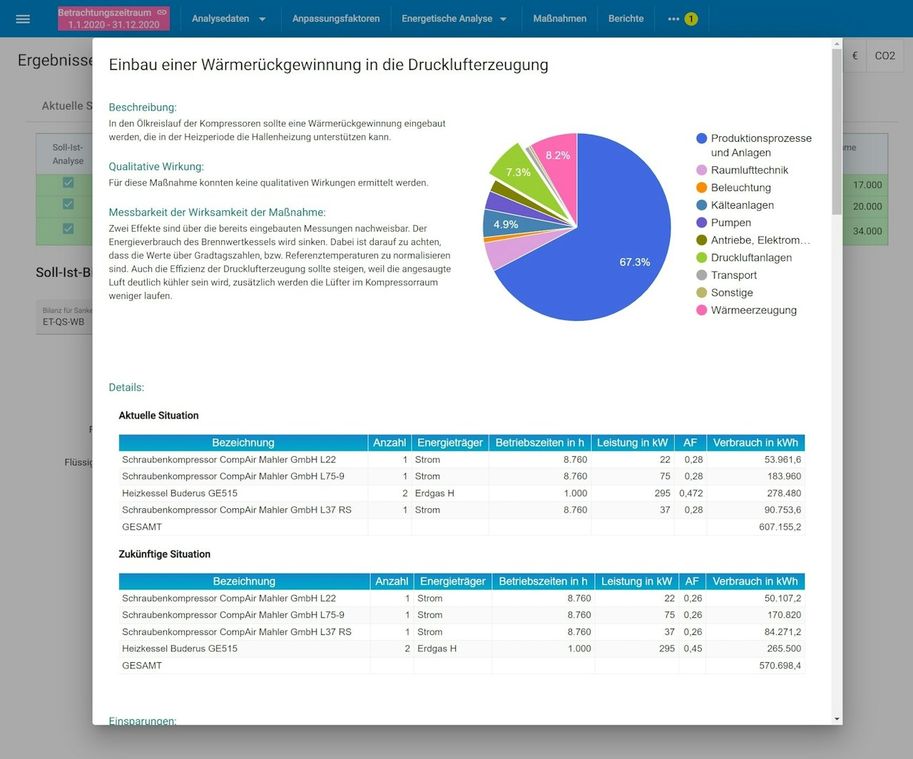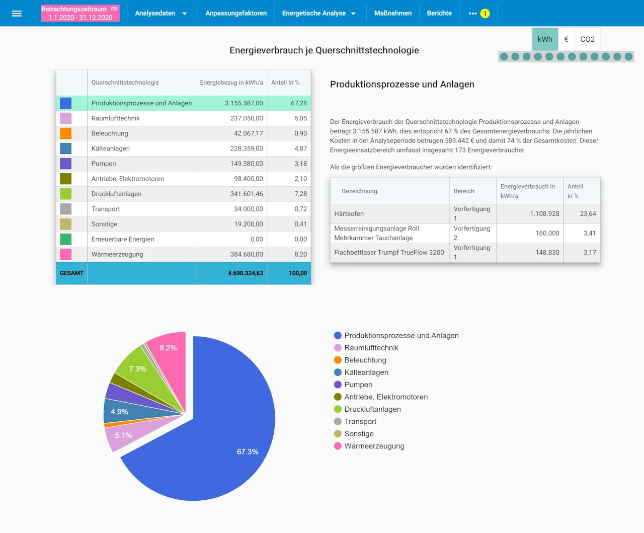 Übersichtlich wird auf verschiedenen Karten der Energiebezug, der Anteil der erneuerbaren Energien, der Energieverbrauch dargestellt. Dabei werden die größten Verbraucher identifiziert und die Verbräuche nach Querschnittstechnologien und Energieeinsatzbereichen aufgeteilt.