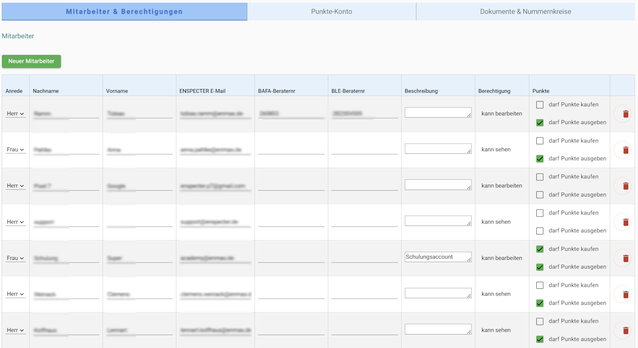 Alle Mitarbeitende die ENSPECTER nutzen, werden angelegt und können mit individuellen Rechten ausgestattet werden.