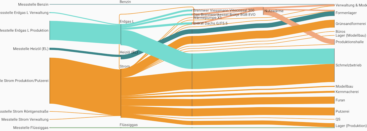 Ein Sankey-Diagramm, das auch zirkuläre Abhängigkeiten, z.B. bei ORC-Anlagen oder Wärmerückgewinnungsanlagen berücksichtigt, gibt einen Überblick über die Energieströme am Standort.