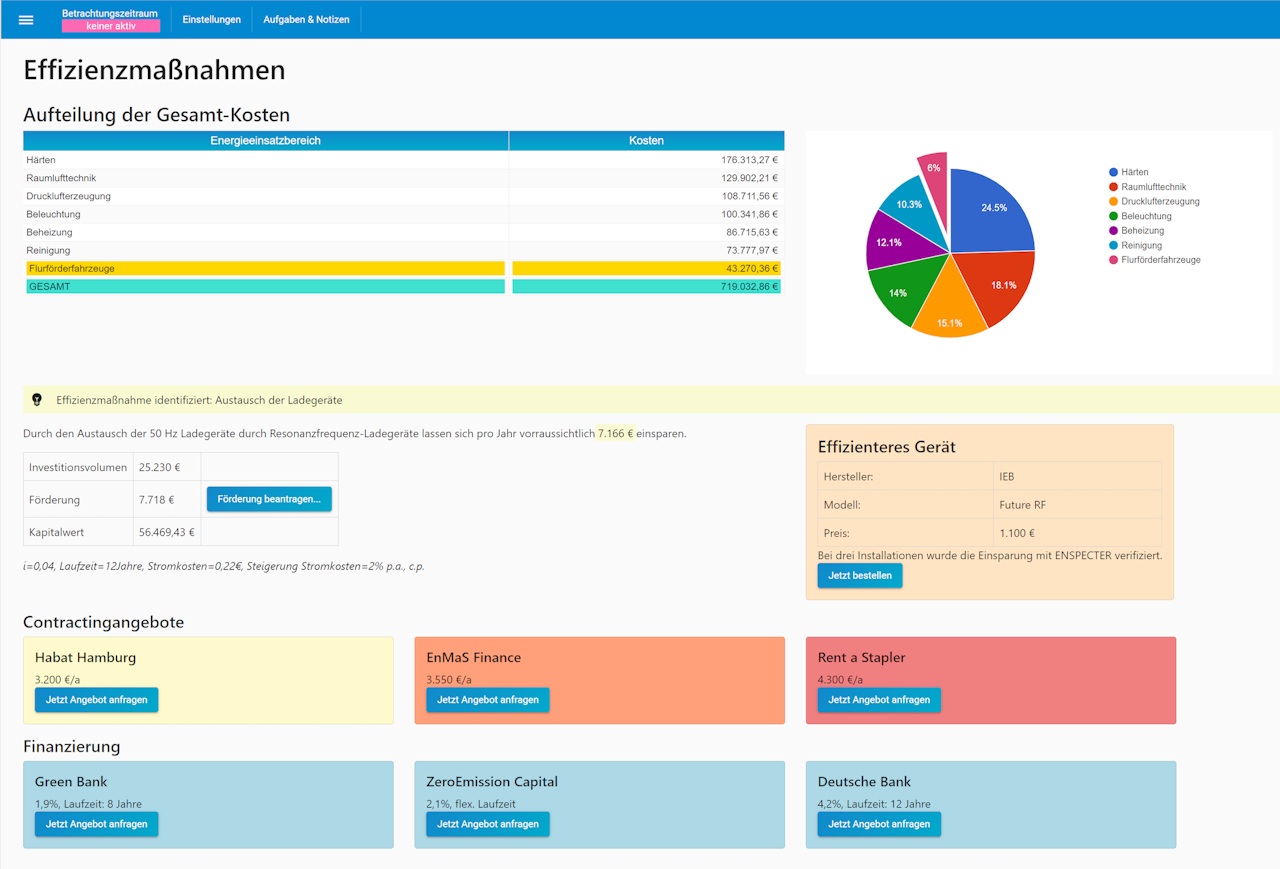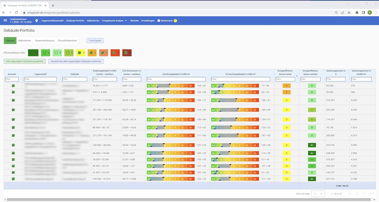 Als Energieberater profitieren Sie von ENSPECTER durch die Möglichkeit, Ihren Kunden ein eigenes Portal anzubieten, in dem sie detailliertere Informationen zu den vorgeschlagenen Effizienzmaßnahmen einsehen können. Mit diesem Portal erhalten Ihre Kunden einen transparenten Einblick in die vorgeschlagenen Maßnahmen und können fundierte Entscheidungen über die Umsetzung in ihren Liegenschaften treffen.