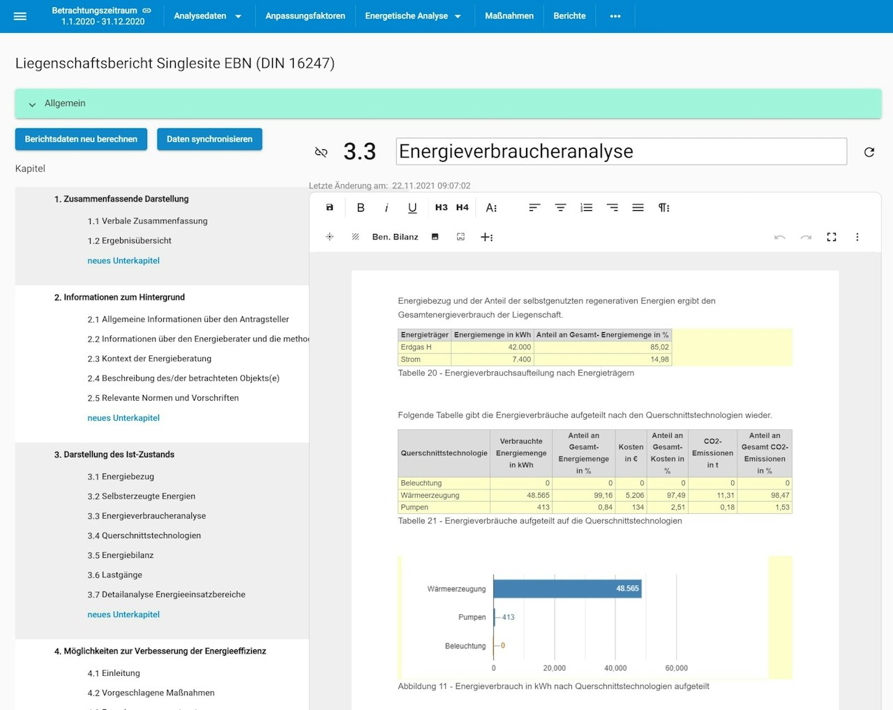 Die Berichtserstellung mit ENSPECTER ist effizient und professionell. Die Plattform bietet Ihnen vordefinierte Berichtsvorlagen, die alle relevanten Informationen enthalten und anpassbar sind. Sie können Ihre Daten nahtlos in die Vorlagen einfügen und zusätzliche Informationen ergänzen, um maßgeschneiderte Berichte zu erstellen. ENSPECTER ermöglicht es Ihnen, automatisch Berechnungen von Einsparungen, Förderhöhen und CO2-Bilanzen durchzuführen, um die Auswirkungen der vorgeschlagenen Maßnahmen zu veranschaulichen. Mit nur wenigen Klicks generieren Sie druckfertige, professionelle Berichte für Ihre Kunden. Durch die effiziente Berichtserstellung mit ENSPECTER sparen Sie Zeit und liefern präzise Informationen, die Ihren Kunden fundierte Entscheidungen ermöglichen.