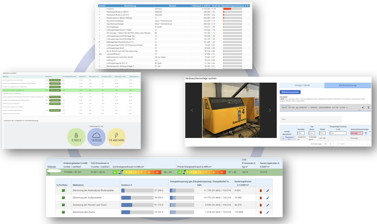 Die Plattform bietet eine Vielzahl von Funktionen, die den gesamten Prozess der Energieberatung optimieren. Dazu gehören eine KI-gestützte Verbrauchererkennung, die automatische Erfassung von Verbraucherdaten durch Auswertung von Fotos, sowie vordefinierte Vorlagen für Effizienzmaßnahmen und Berichte. Dadurch wird die Datenerfassung vor Ort vereinfacht und beschleunigt, während die Berichterstellung strukturiert und effizient erfolgen kann.