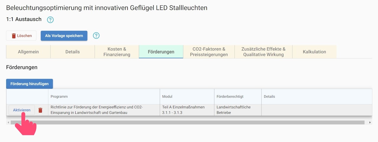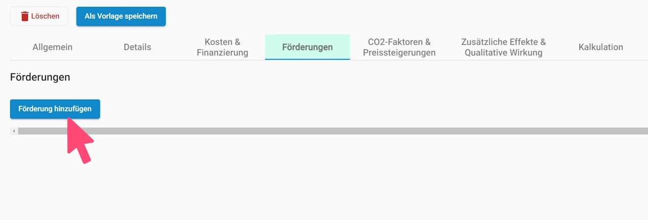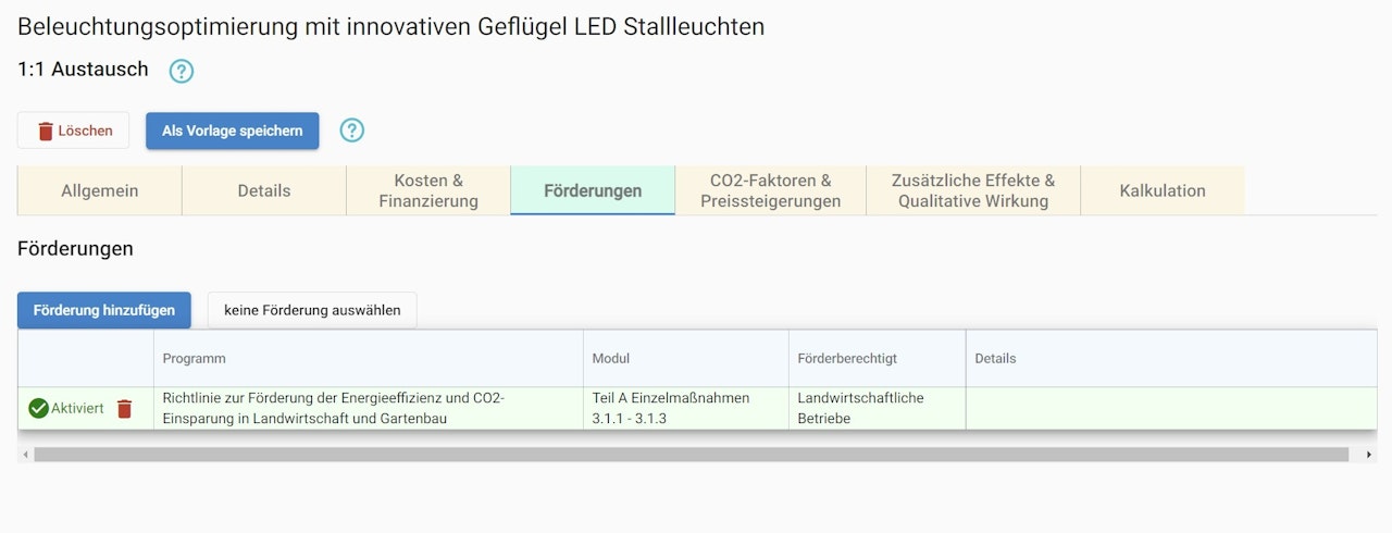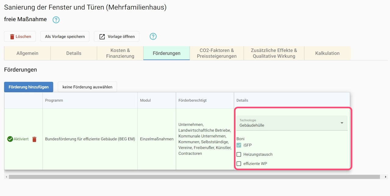 Bei einigen Förderungen müssen noch Details eingegeben werden, damit die Förderung angewendet werden kann. Die Details können in der letzten Tabellenspalte spezifiziert werden.