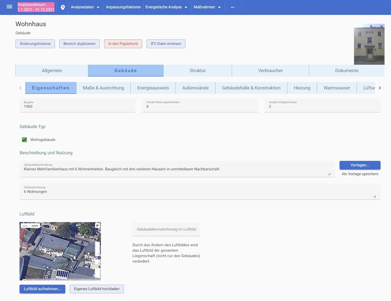 Im ersten Schritt werden die Grunddaten eines Gebäudes erfasst, darunter z.B. das Baujahr, eine kurze Beschreibung und auch ein Luftbild kann mit ENSPECTER automatisch aus der Liegenschaftsadresse erstellt werden..