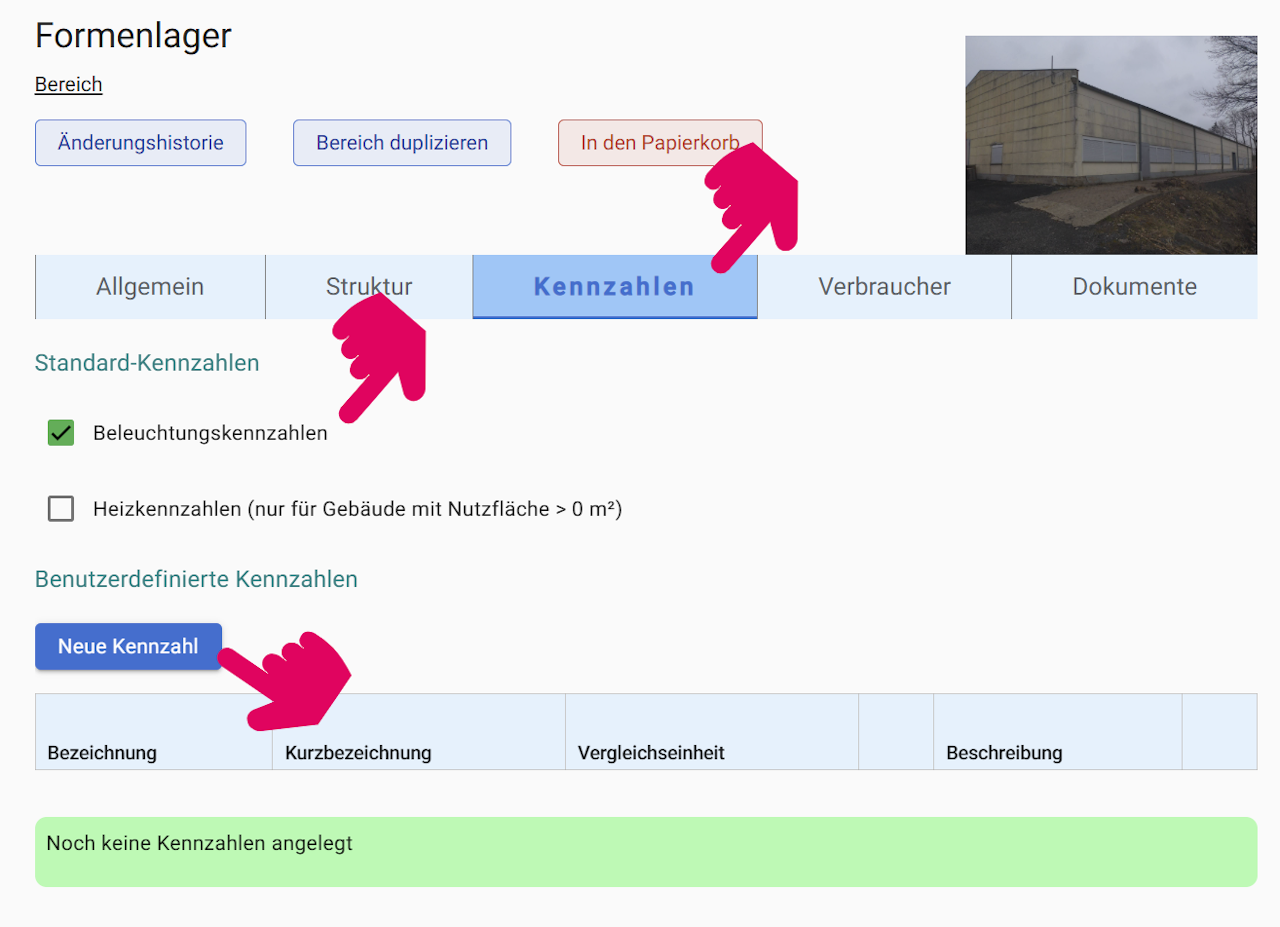 Für Bereiche können ebenfalls benutzerdefinierte Kennzahlen hinzugefügt werden, und Sie können angeben, ob Standardkennzahlen wie Beleuchtungs- oder Heizkennzahlen berechnet werden sollen.
