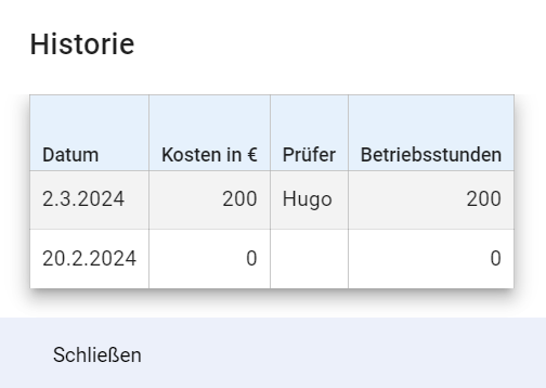 Mit einem Klick auf die Schaltfläche "Historie" können Sie sich alle durchgeführten Wartungen/ Prüfungen ansehen.