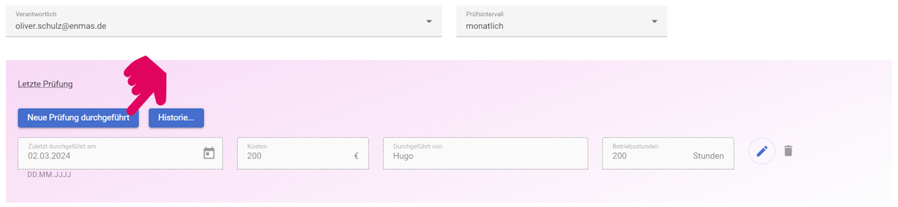 Sobald eine Wartung/ Prüfung durchgeführt wurde, drücken Sie auf den Knopf "Neue Wartung/ Prüfung durchgeführt". Die darunter liegende Eingabezeile wird aktiv und im Datumsfeld der letzten Prüfung steht das Datum des aktuellen Tages. Sie können das Datum auf das Datum der letzten Prüfung setzen, sowie die Kosten, den Prüfer sowie den aktuellen Stand der Betriebsstunden der Anlage erfassen.