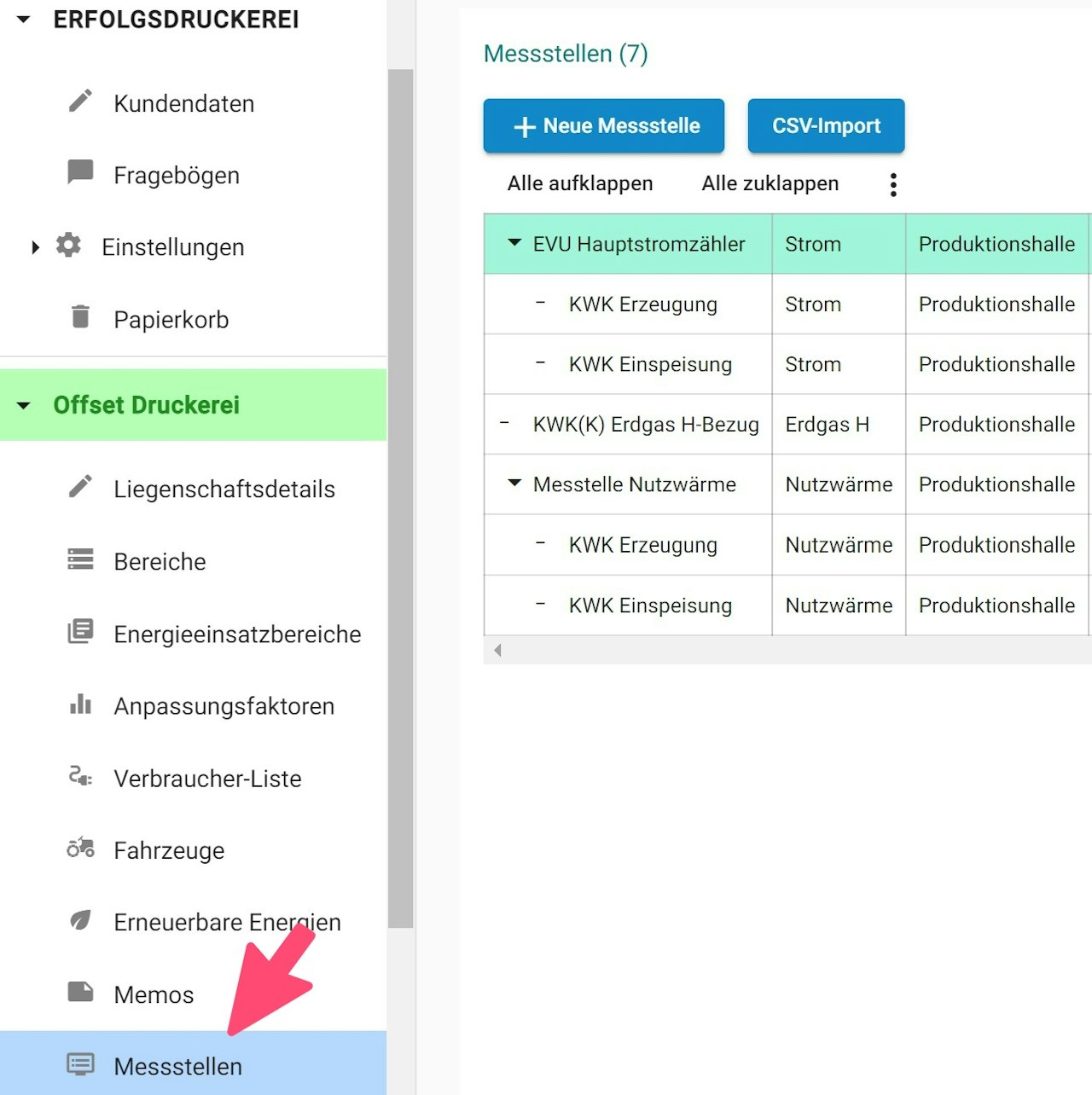 Für jeden Energieträger, welchen du bei den Verbrauchern ausgewählt hast, wird durch die Software ENSPECTER automatisch auch eine Messstelle angelegt. Diese kannst du in dem Menü auf der linken Bildschirmseite unter Messstellen einsehen.