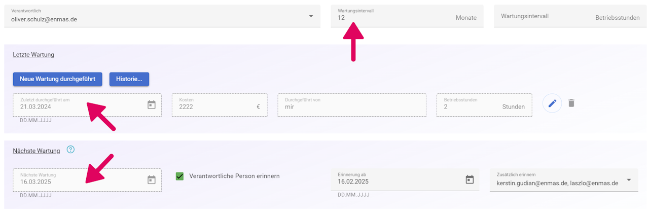 Ausgehende von der zuletzt durchgeführten Wartung/ Prüfung und dem hinterlegten Intervall wird automatisch der nächste Termin für den nächsten Check errechnet. Diesen Termin können Sie manuell nicht ändern.