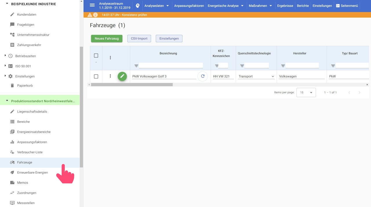 Fahrzeuge kann man in ENSPECTER auf der Fahrzeug-Übersichtsseite anlegen und bearbeiten. Klicken Sie dazu im Seitenmenü auf den Punkt "Fahrzeuge".