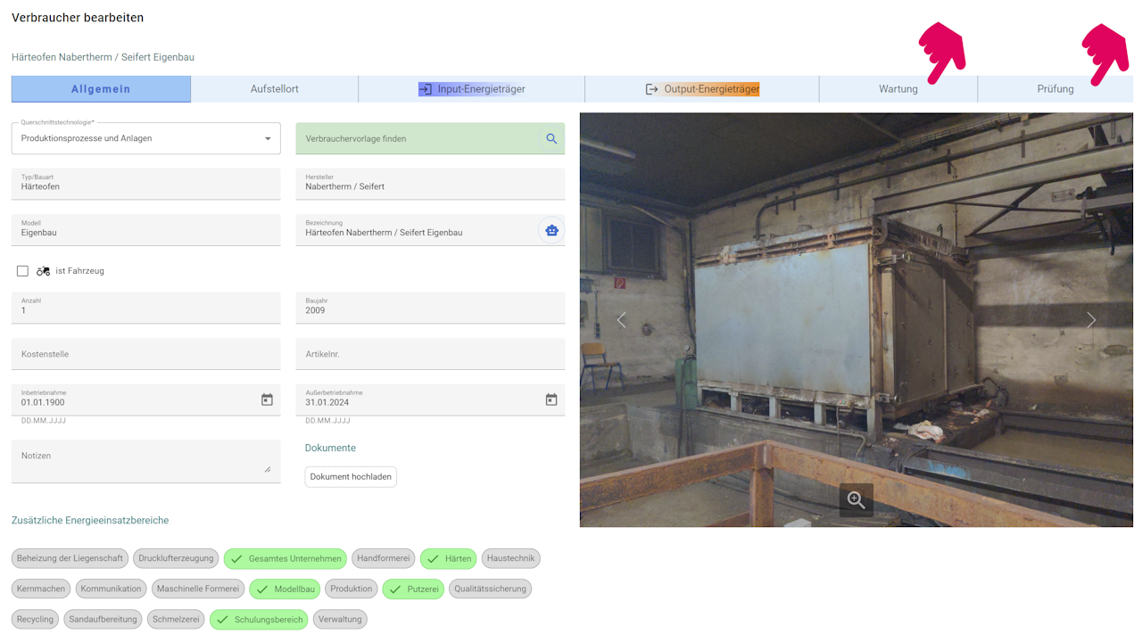 In dem Popup gibt es zwei Tabs. Einen zum Bearbeiten der Wartungen, der andere zum Bearbeiten der Prüfungen.