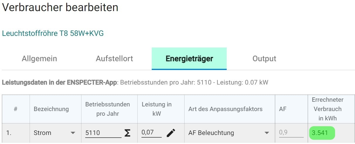 Leistung x Betriebsstunden x Anpassungsfaktor = Verbrauch
